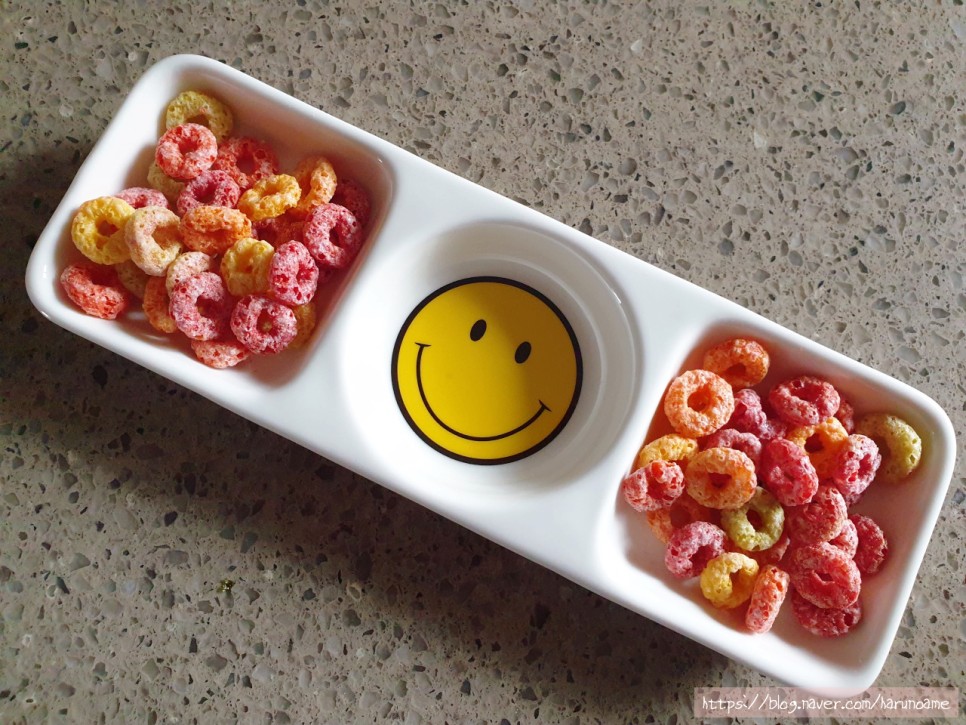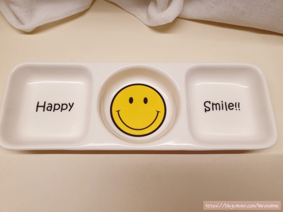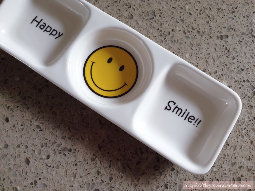 그중에서 제가 주문한 건데요! 스마일 3구 접시입니다.^^ 노란 스마일이 귀여운 핸드메이드 도자기 그릇. 이렇게 셋으로 갈라진 그릇이 은근히 많이 쓰이게 된 거죠.